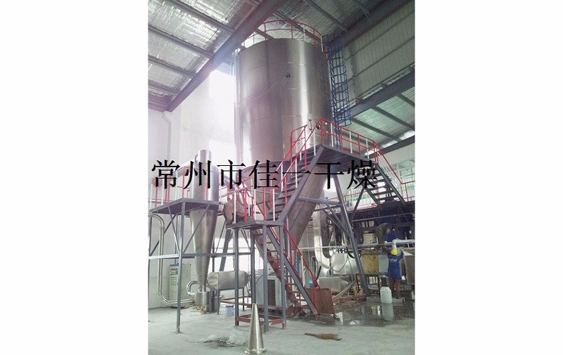 空氣經過濾和加熱,進入干燥器頂部空氣分配器,熱空氣呈螺旋狀均勻地進入干燥室。料液經塔體頂部的高速離心霧化器,(旋轉)噴霧成極細微的霧狀液珠,與熱空氣并流接觸在極短的時間內可干燥為成品。成品連續地由干燥塔底部和旋風分離器中輸出,廢氣由風機排空。